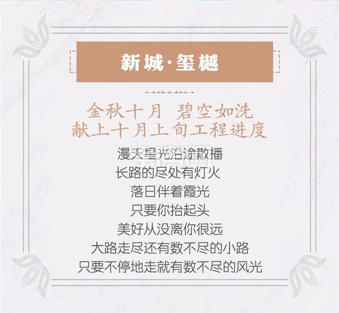 漫天星光沿途散播,長路的盡處有燈火,落日伴著霞光,只要你抬起頭,美好從沒離你很遠,大路走盡還有數(shù)不盡的小路,只要不停地走就有數(shù)不盡的風光,新城璽樾10月工程進度如期而至!...[閱讀全文]