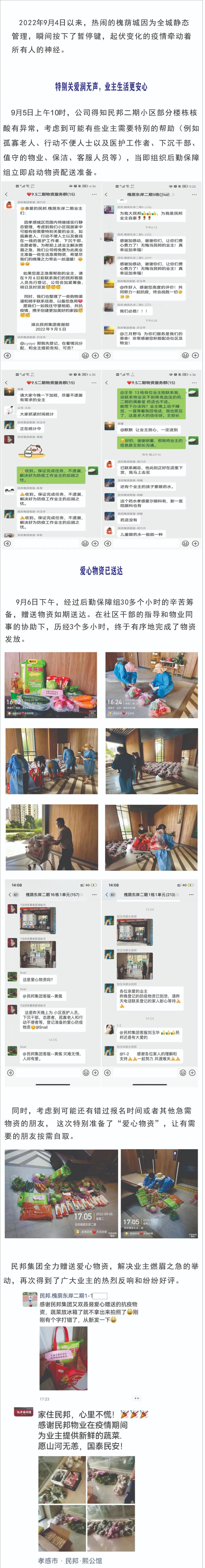 2022年3月27日,民邦·熙公館小區(qū)B棟發(fā)現(xiàn)密接者,當晚凌晨1點本棟業(yè)主緊急全員核酸,并實行封閉管理。由于事發(fā)突然,大部分業(yè)主并未采購必要生活物資。民邦公司緊急采購一批生活物資,愛心配送給封閉管理業(yè)主。別擔心,請放心民邦伴您安心居家民邦公司集中采購:魚 豬肉 雞蛋 各類新鮮蔬菜 水果 油米等生活物資無償送給業(yè)主。分揀裝袋配送,為業(yè)主服務到家每個家園的美好都...[閱讀全文]