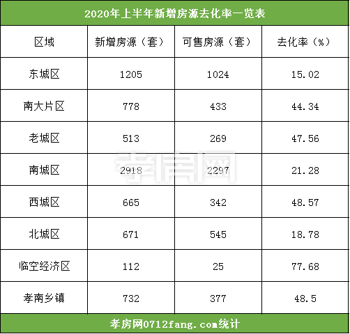 二、2020年上半年孝感各區(qū)域新增房源統(tǒng)計對比