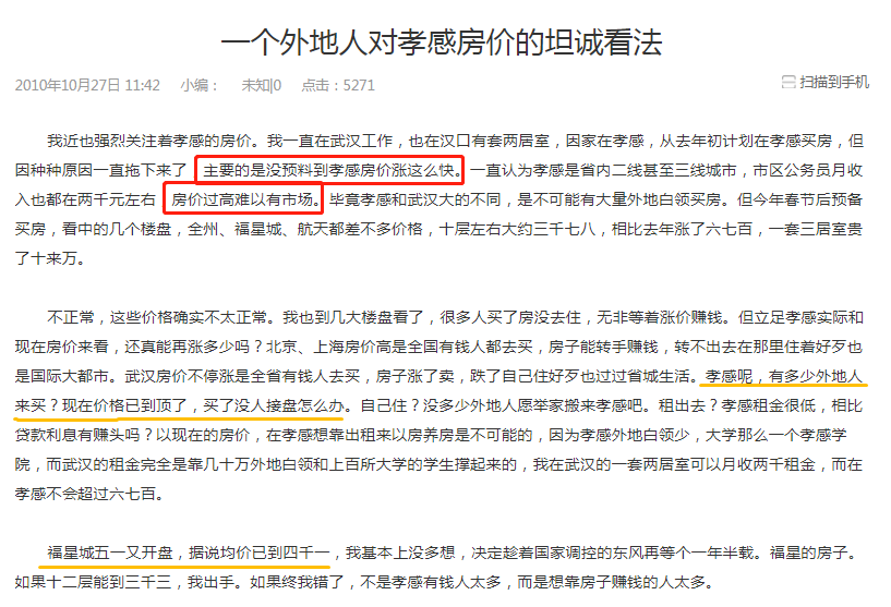 這位網(wǎng)友是一位武漢準備到孝感購房的朋友,2010年十月份看的房子,這個時候已經(jīng)比他預期的房價要貴很多了。