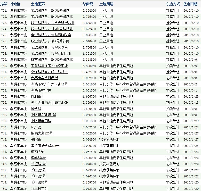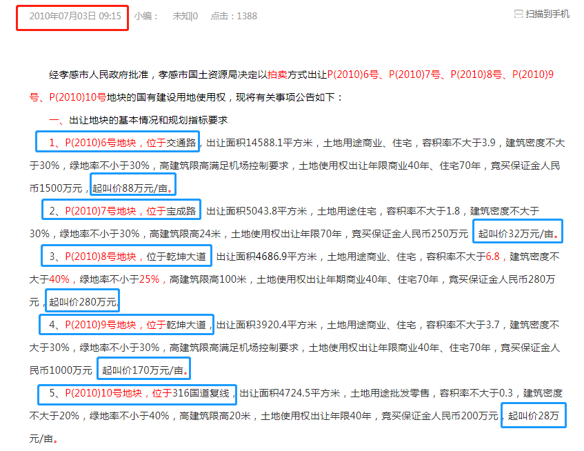 2010年7月份孝感的拍賣(mài)出讓公告,當(dāng)時(shí)的起拍價(jià)基本在100萬(wàn)/畝內(nèi),比較高的是乾坤大道沿線(xiàn)的地塊。