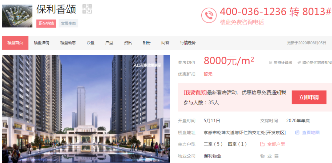 2018年6月央企保利進(jìn)駐孝感,擲金6.64億摘得孝感東城區(qū)地塊,土地單價(jià)僅8850元/㎡,出讓面積逾7.508085公頃,溢價(jià)率僅84.38元/㎡,目前項(xiàng)目名為保利香頌,現(xiàn)均價(jià)8000元/㎡。