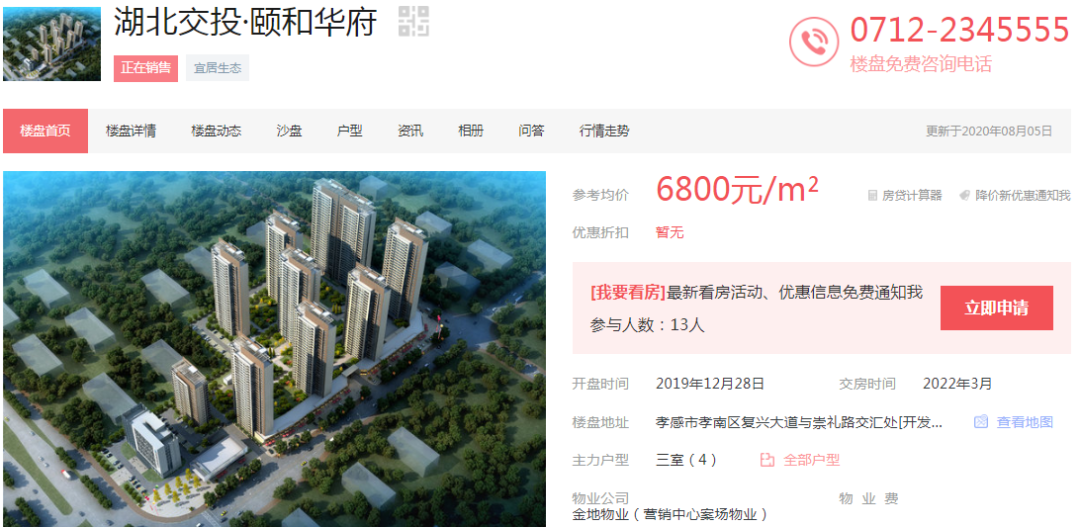 2018年10月19日,湖北交投拿下孝國(guó)土開(kāi)P(2018)14號(hào)地塊位于孝感市乾坤大道以北、縱5號(hào)路以西地塊,成交價(jià)410萬(wàn)/畝。項(xiàng)目名為湖北交投頤和華府,現(xiàn)均價(jià)6800元/㎡