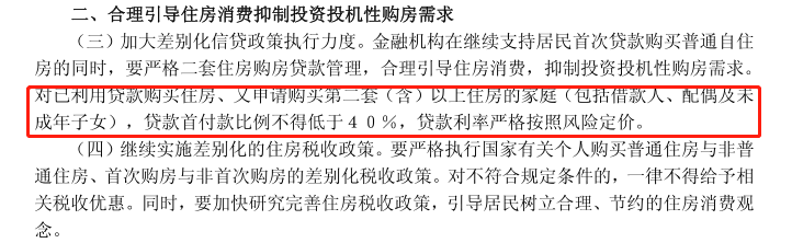 對二套房不再區(qū)分改善型和非改善型,一概執(zhí)行40%首付;明確要求央行及銀監(jiān)會要加大對金融機(jī)構(gòu)房地產(chǎn)貸款業(yè)務(wù)的監(jiān)督管理和窗口指導(dǎo);加強(qiáng)監(jiān)控跨境投融資活動,防境外“熱錢”沖擊中國市場。