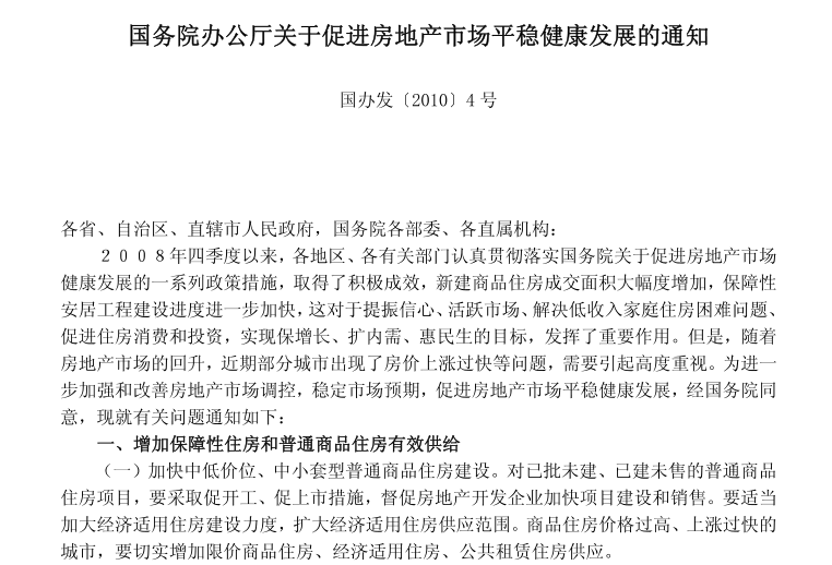 2010年4月15日,國務(wù)院出臺措施,要求對貸款購買第二套住房的家庭,貸款首付款不得低于50%,貸款利率不得低于基準(zhǔn)利率的1.1倍。