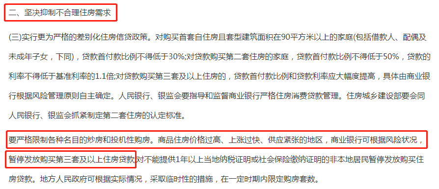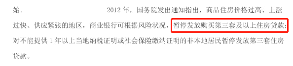 2012年,國務(wù)院發(fā)出通知指出,商品住房價格過高、上漲過快、供應(yīng)緊張的地區(qū),商業(yè)銀行可根據(jù)風(fēng)險狀況,暫停發(fā)放購買第三套及以上住房貸款;對不能提供1年以上當(dāng)?shù)丶{稅證明或社會保險繳納證明的非本地居民暫停發(fā)放第三套住房貸款。