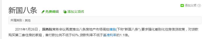 “新國八條”的具體內(nèi)容把二套房貸首付比例提至60%,貸款利率提至基準(zhǔn)利率的1.1倍。加上此前的政策,2011年,首套房商業(yè)貸款的首付為30%,第三套及以上住房不發(fā)放商業(yè)貸款。