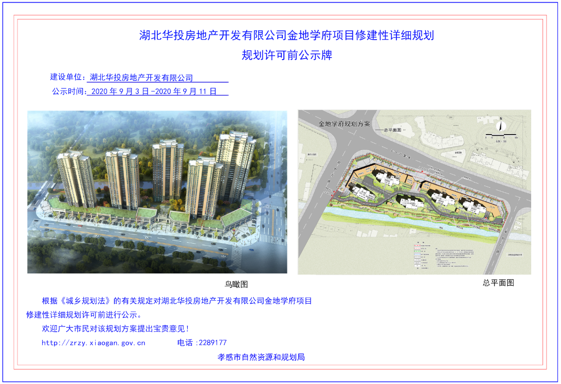 2020.9.3日,孝感市自然資源和規(guī)劃局網(wǎng)站對于湖北華投房地產(chǎn)開發(fā)有限公司金地學(xué)府項(xiàng)目修建性詳細(xì)規(guī)劃方案批前公示。
