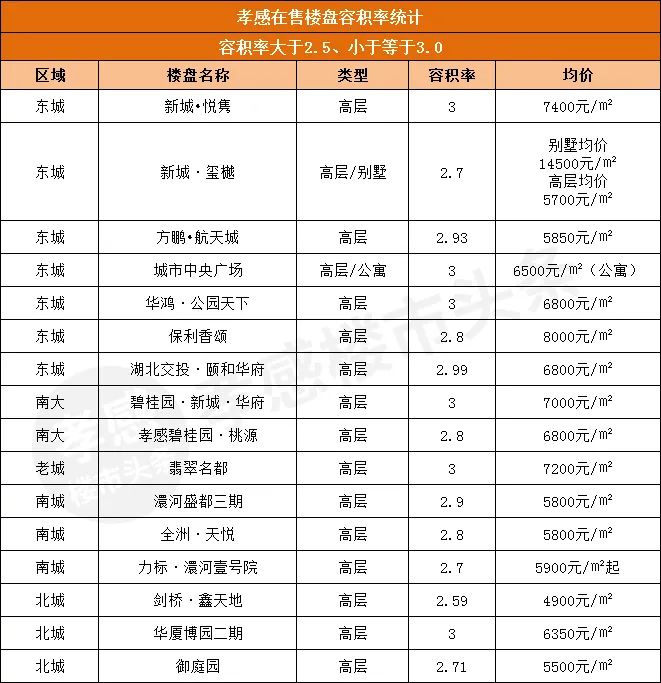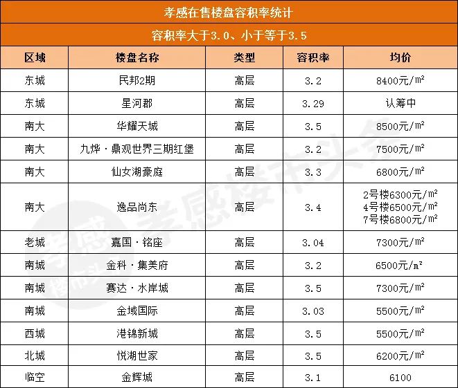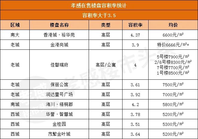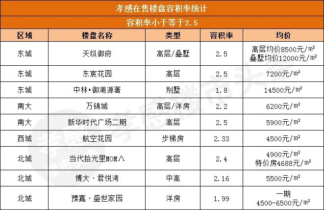 我在這里整理了孝感7大區(qū)域目前主要在售或待售的47個(gè)住宅樓盤(pán),它們的容積率都是多少呢?