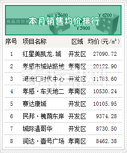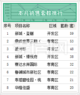 10月份截止目前為止,孝感新房銷售套數(shù)排行榜前8分別為:新城璽樾、九燁·鼎觀世界三期紅堡、星河郡、新城悅雋、賽達(dá)·水岸城、萬(wàn)錦城、孝感碧桂園·桃源 、華隆佳盛。