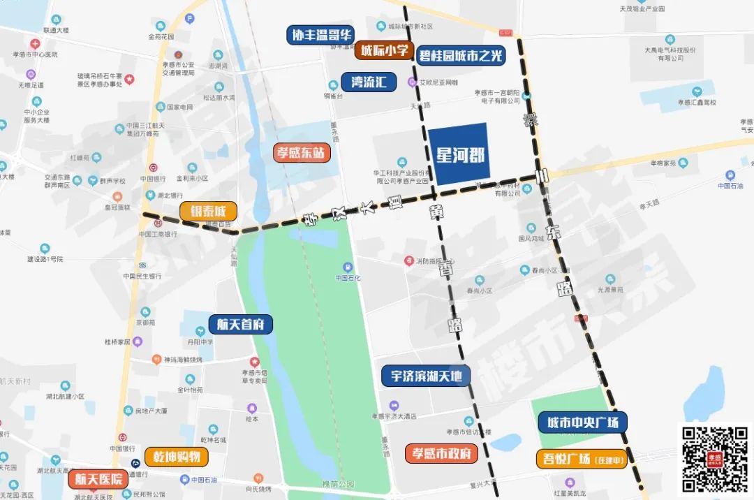 星河郡位于東城區(qū)孝漢大道與黃香路交匯處,小區(qū)周邊有孝感東站,城際小學(xué),孝感市政府,銀泰城,吾悅廣場(chǎng)(在建中)等,整體來(lái)看,該小區(qū)配套較為完善。