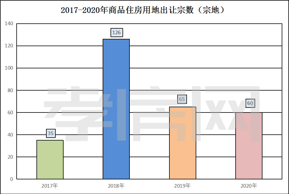 ? ? ? ?2020年,孝感樓市共有60宗商品住房土地出讓,出讓總規(guī)劃面積約189.75公頃,總成交金額約524158.86萬(wàn)元(52.4億)。其中29宗地為掛牌出讓,拍賣地塊30宗,協(xié)議出讓地塊1宗。