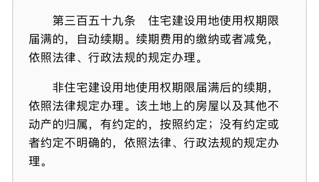 ? ? ? ?主要說的就是土地使用權(quán)滿70年之后,可以自動續(xù)期,不必?fù)?dān)心土地被收回,也不用單獨(dú)去辦理。