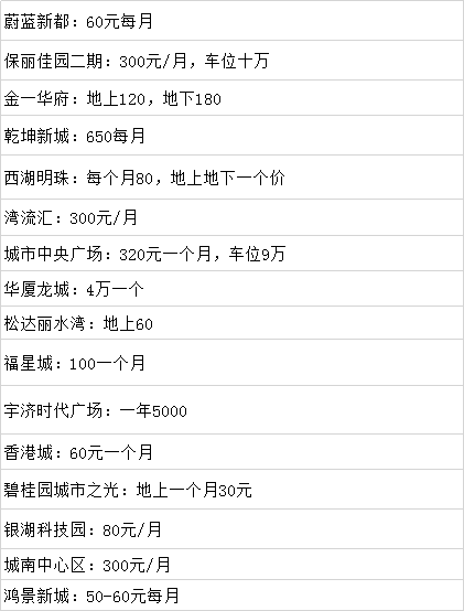 ? ? ? ?小編根據(jù)業(yè)主的反饋也搜集了一下孝感部分小區(qū)的一個(gè)車位費(fèi)情況。