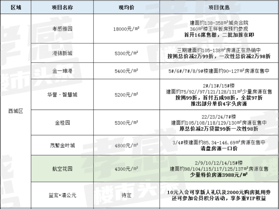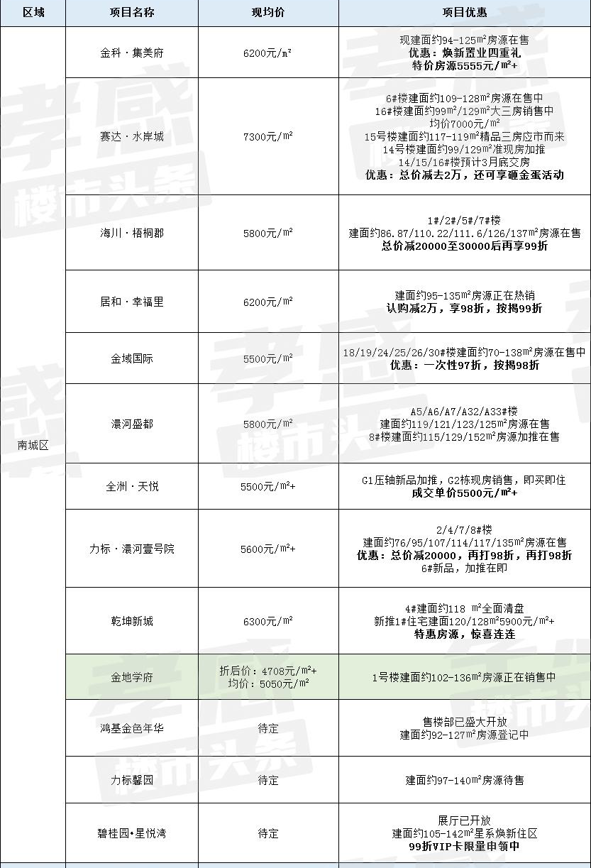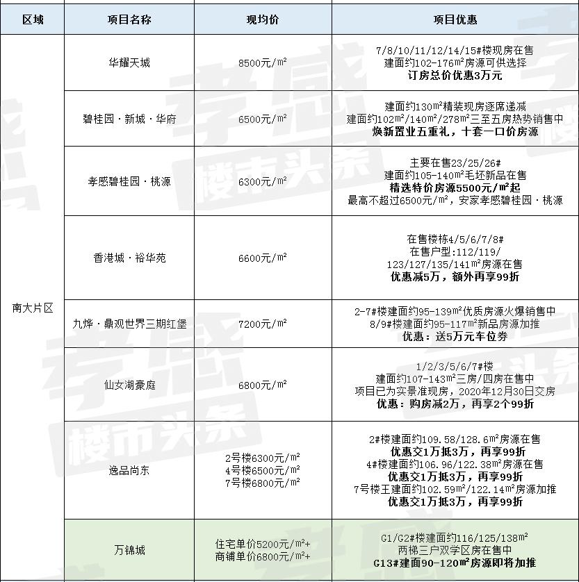 除開孝感最貴的豪宅孝感雅園今年推出,其他在售的6個項目均是老盤。