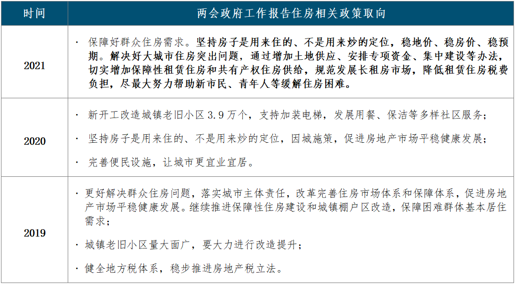 2021年兩會(huì)提出“房住不炒”總基調(diào)不變,穩(wěn)地價(jià)、穩(wěn)房價(jià)、穩(wěn)預(yù)期,在報(bào)告中得到重申,說明樓市調(diào)控的目標(biāo)依舊是“維穩(wěn)”,既要遏制大漲,又要防范大跌。