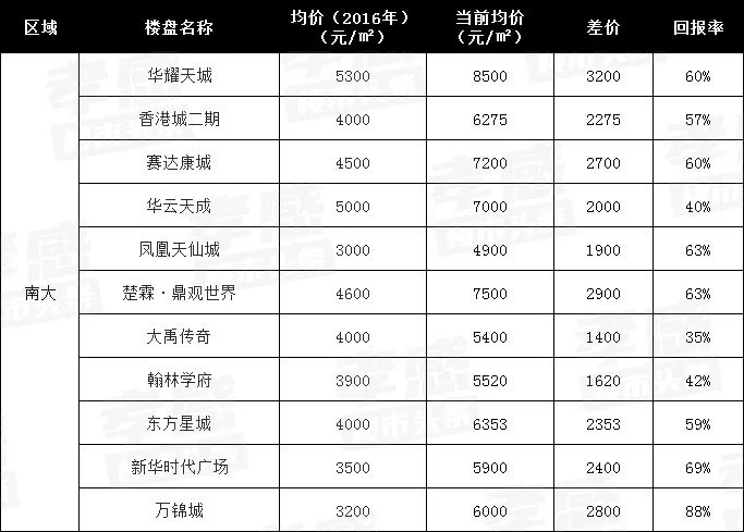 ? ? ? ?南大的這些樓盤(pán)基本上回報(bào)率都在百分之50-60左右,其中萬(wàn)錦城的漲幅都是最高的,從曾經(jīng)的3200元/㎡一躍到現(xiàn)在的均價(jià)6000元/㎡。
