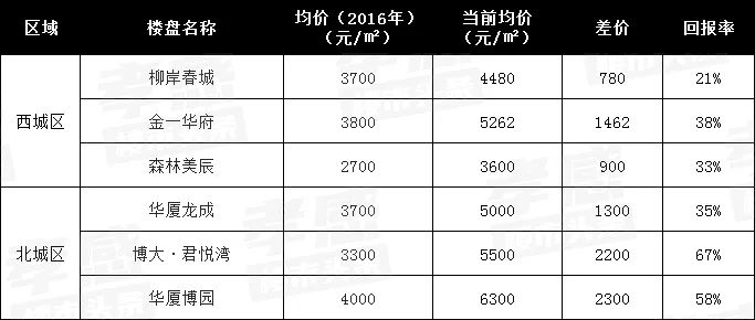 ? ? ? ?北城區(qū)的樓盤(pán)漲價(jià)幅度較大,差價(jià)在1300-2300之間,回報(bào)率在百分之35-70之間。
