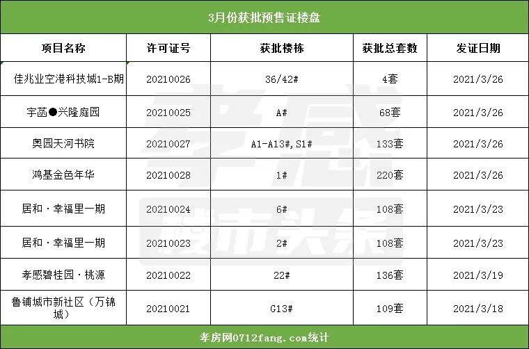 3月份共7個項目取證,獲批886套房源,其中臨空區(qū)有兩個項目,另外五個項目均為孝南區(qū),這五個項目都屬于老盤加推。