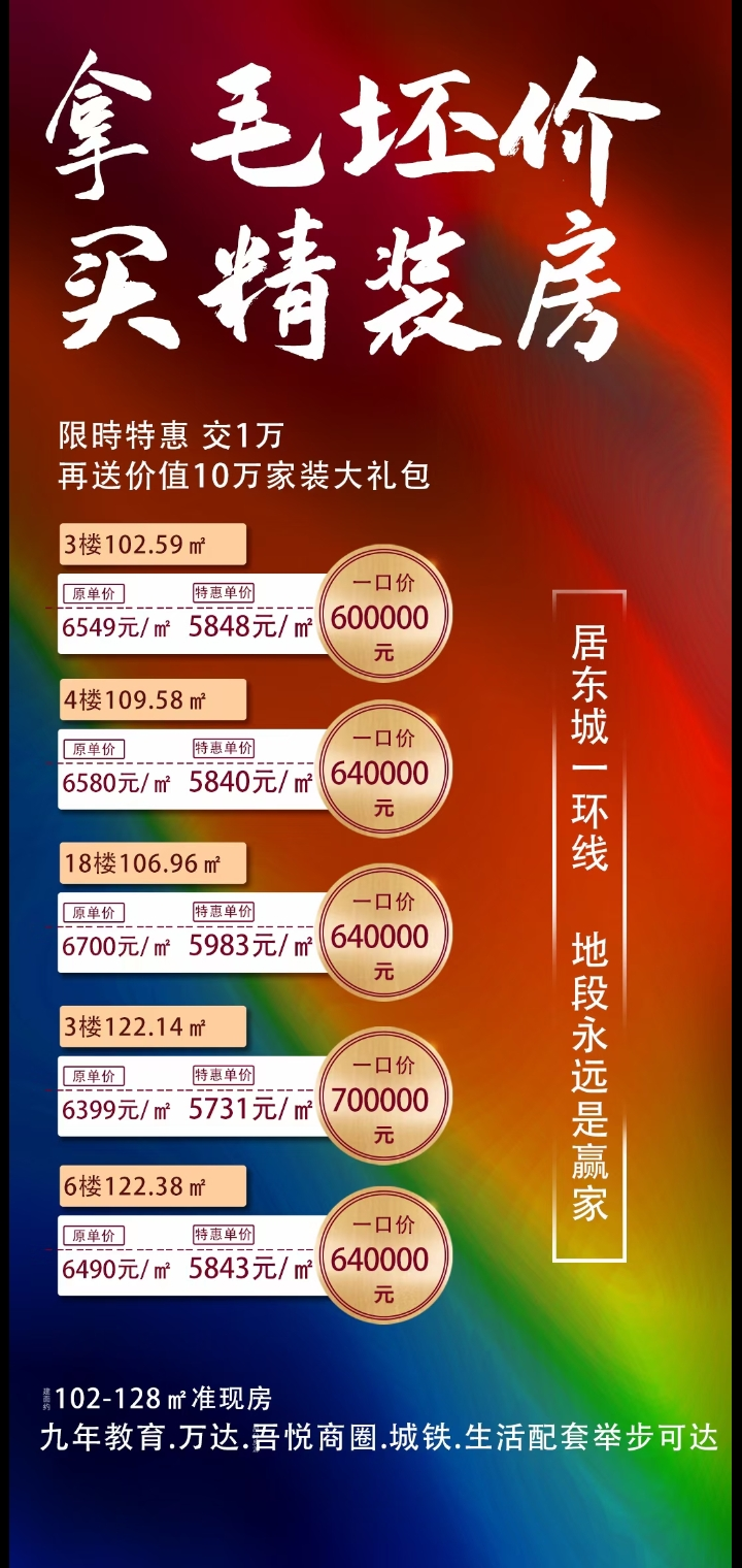? ? ? ?澴川路上的逸品尚東更是打出拿毛坯價買精裝房口號,不僅推出5套特價好房,交一萬還能送價值10萬家裝大禮包,剛需人群確實可以考慮。