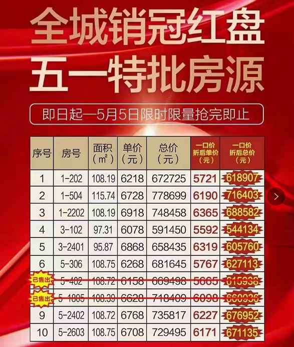 ? ? ? ?南大片區(qū)九燁·鼎觀世界三期紅堡已經(jīng)接近尾聲,房子是賣一套少一套,五一活動期間拿出10套特價房,堪稱明星盤中的豪氣手。