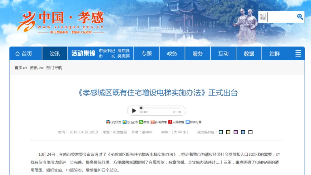 2018年10月《孝感城區(qū)既有住宅增設電梯實施辦法》出臺,《辦法》重點明確了適用范圍、組織實施、申報驗收、后期維護等四個部分