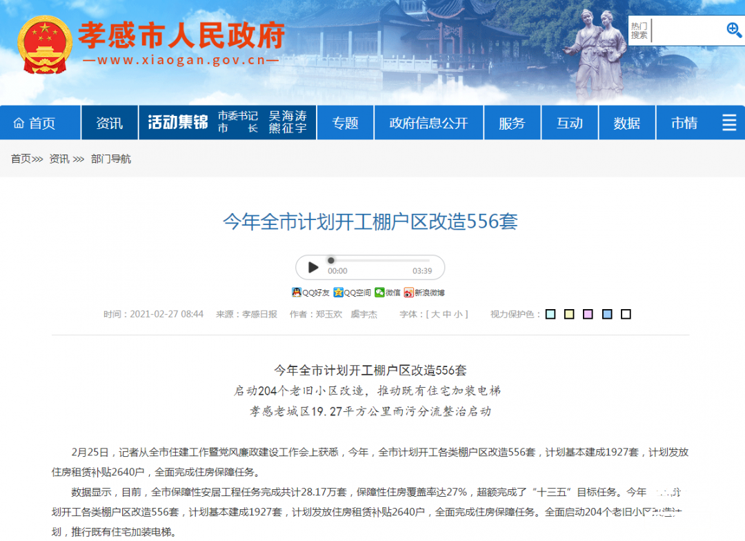 2021年2月全市計劃開工棚戶區(qū)改造556套,啟動204個老舊小區(qū)改造,推動既有住宅加裝電梯 ,孝感老城區(qū)19.27平方公里雨污分流整治啟動。