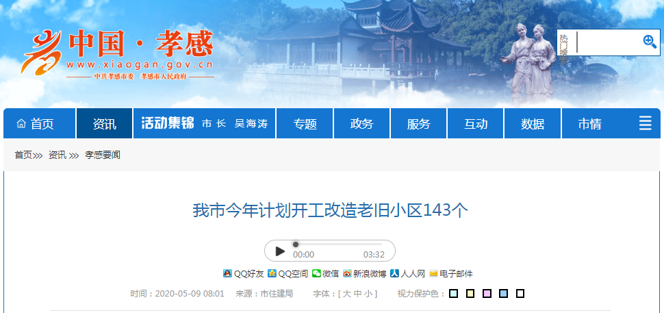 2020年5月我市計劃改造老舊小區(qū)143個,涉及24018戶,其中孝感城區(qū)108個,16198戶。