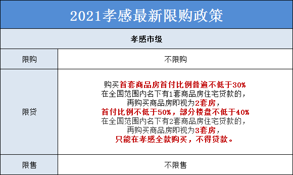 ? ? ? ?■限貸:首套商品房首付比例普遍不低于30%,二套首付比列不低于50%(部分樓盤不低于40%),三套及以上只能在孝感全款購買,不得貸款。