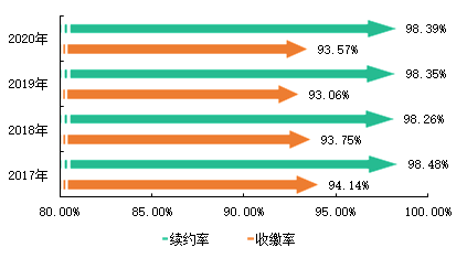 據(jù)數(shù)據(jù)顯示,2020年,百?gòu)?qiáng)企業(yè)物業(yè)服務(wù)費(fèi)收繳率均值為93.57%,續(xù)約率均值為98.39%。