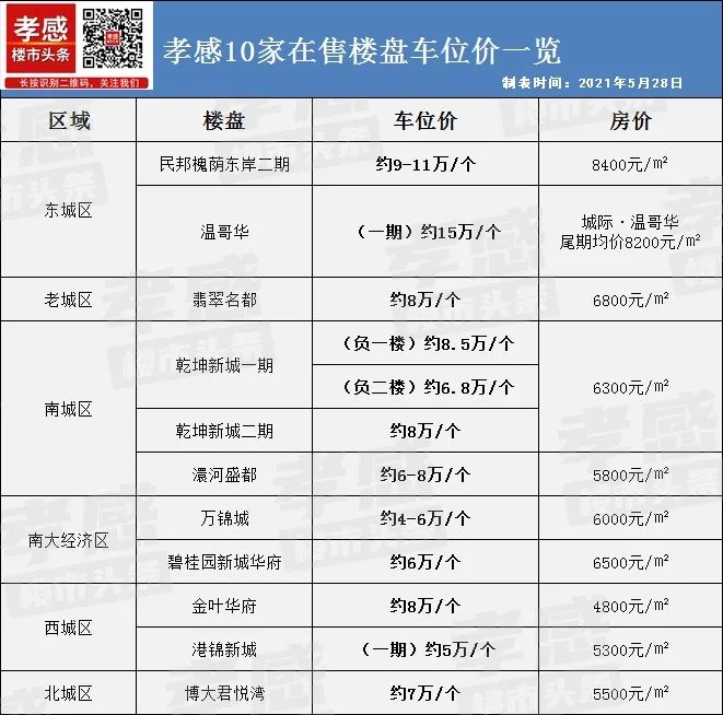 1、出爐!孝感10家樓盤車位價(jià)曝光,最貴約15萬/個(gè)
