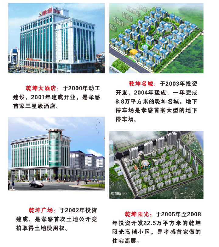 ? ? ? 在孝感建設(shè)了兩家星級酒店和兩家大型購物中心,2003年開始相繼開發(fā)多個住宅項目,我們熟知的就有乾坤豪府、乾坤陽光、乾坤名城等。