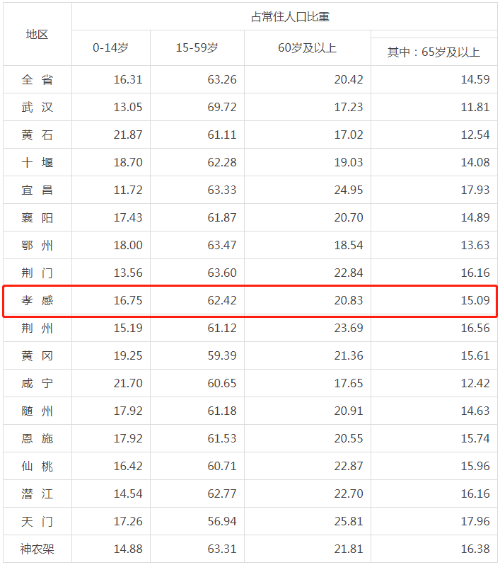 從年齡構(gòu)成上看孝感,0-14歲人口占16.75%;15-59歲人口占62.42%,中青年人口數(shù)量還是比較可觀的,勞動(dòng)力人口相對(duì)充沛。
