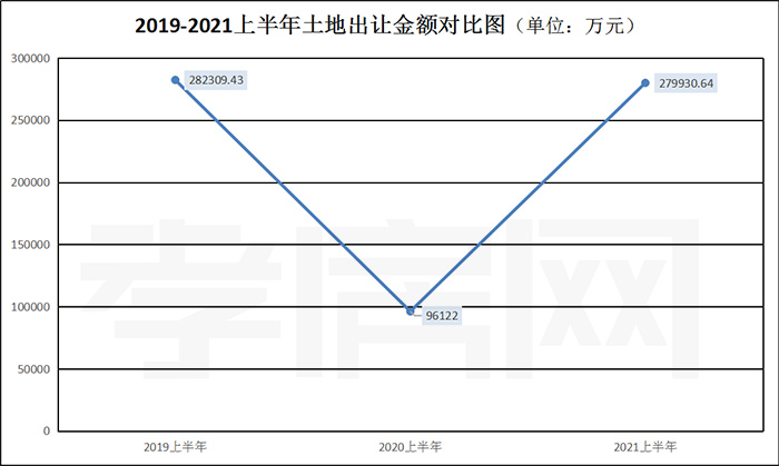 ? ? ? ?從成交金額來看,2021上半年的成交金額同比2020上半年成交金額上漲191.22%,相比2019年下降0.84%,雖然今年的成交金額并沒有2019年高,但是我們可以看一下2019年的成交宗地和2021年的成交宗地相比高出了13宗,在高出13宗的情況下,本年的成交金額和2019年的成交金額僅下降0.84%的細(xì)微差別,也就是說在今年上半年單塊土地的成交金額要整體高于2019和2020年,土地的成交價格有上漲的趨勢。