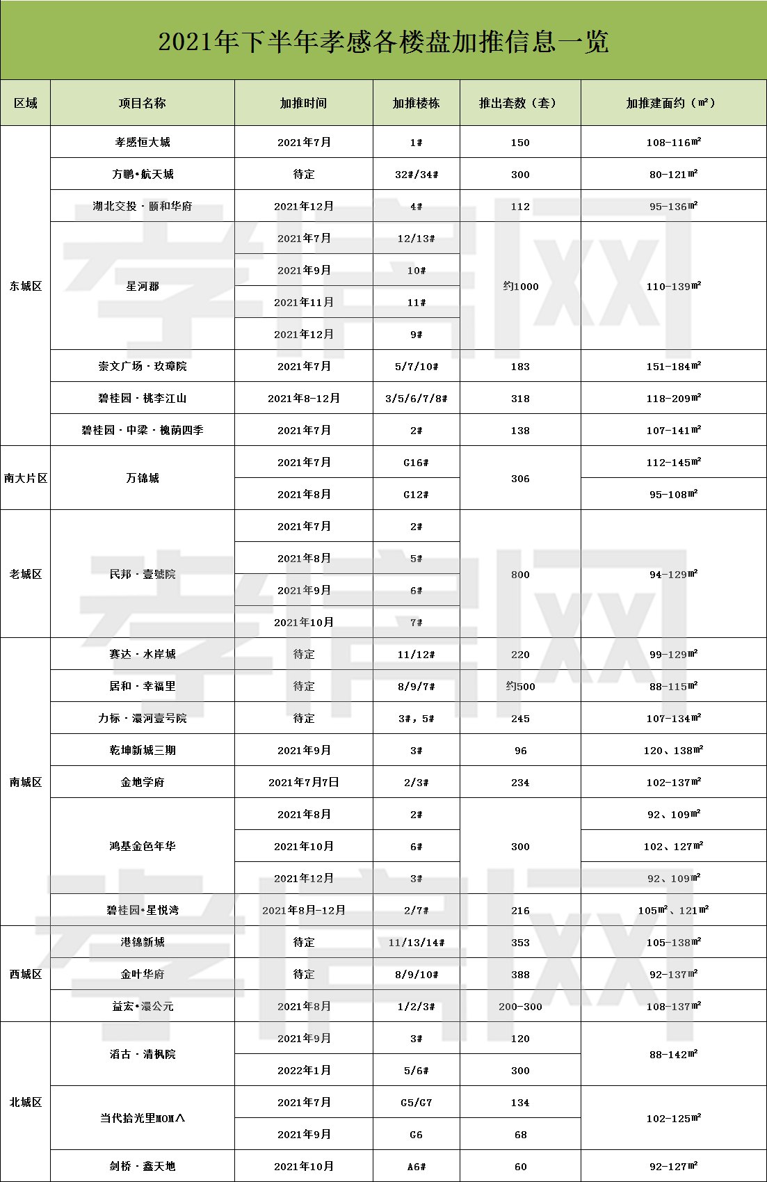 ? ? ? 據(jù)孝房網(wǎng)房網(wǎng)統(tǒng)計,2021年下半年孝感即將迎來20盤入市加推,加推房源超6700套,其中主要以東城和南城為主,作為孝感樓市目前的熱門區(qū)域,趁熱打鐵,將于下半年推出約4000套房源。