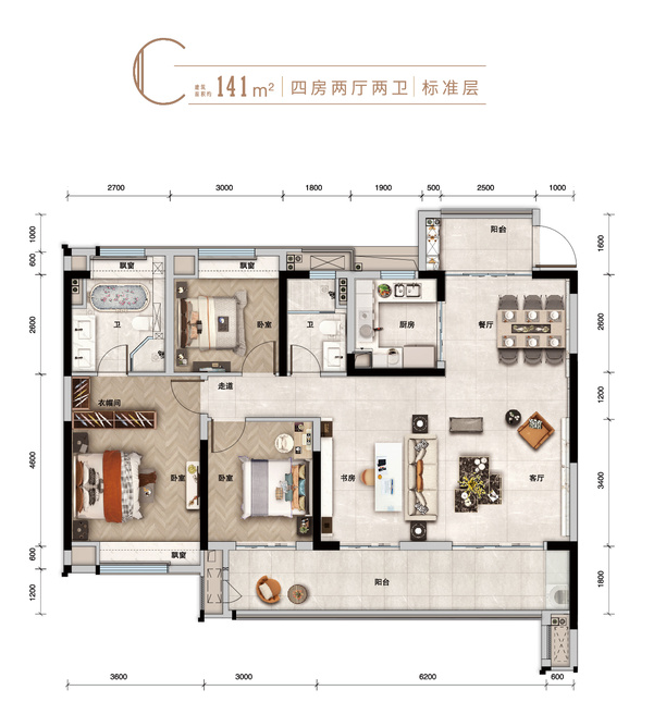 ? ? 戶型分析:項(xiàng)目設(shè)計(jì)時(shí),以四房為起點(diǎn),打造135㎡-185㎡闊綽一梯一戶的戶型,均配有超大景觀陽(yáng)臺(tái),居住舒適性很高。
