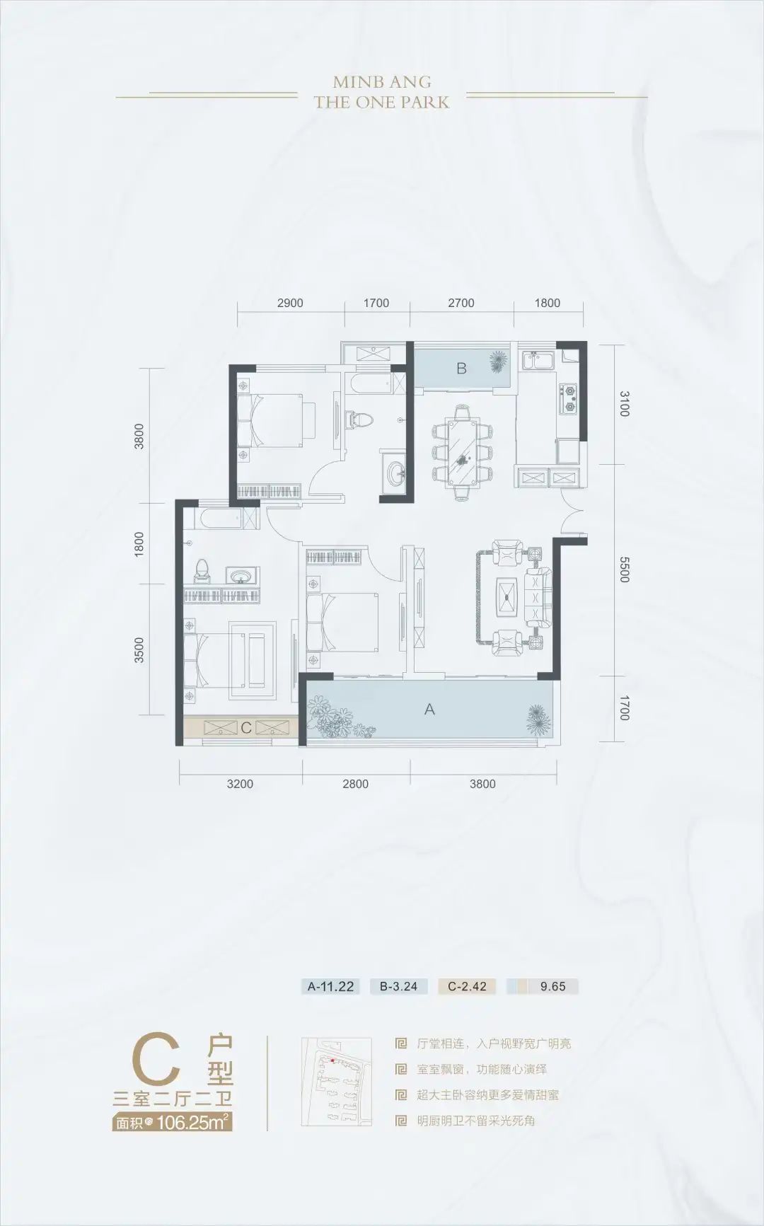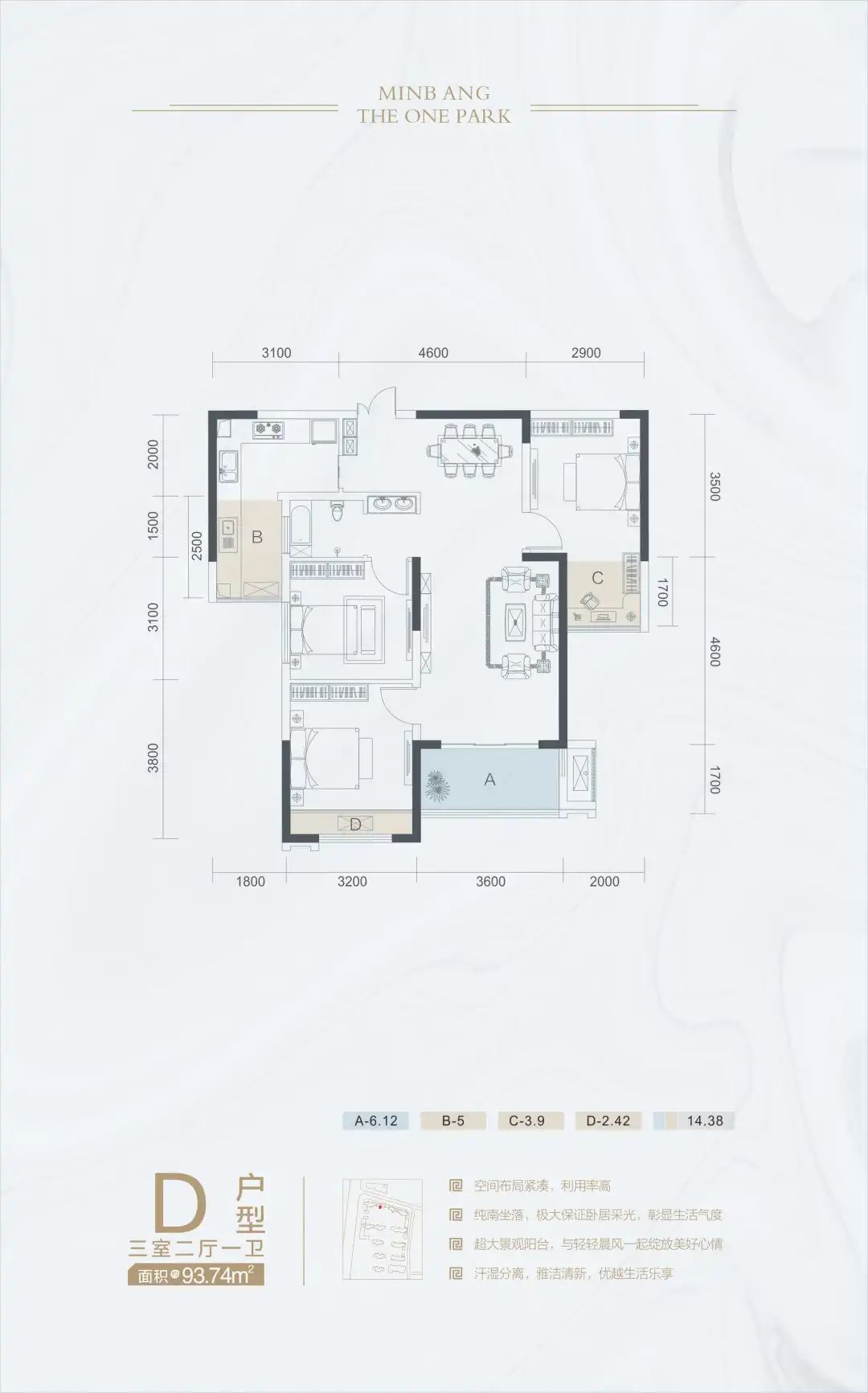 ? ? 戶型分析:最小戶型建面約94㎡,大大的降低了一些剛需客戶的購(gòu)房成本,且每一個(gè)戶型贈(zèng)送面積都很高,戶型設(shè)計(jì)也十分符合人居需求。