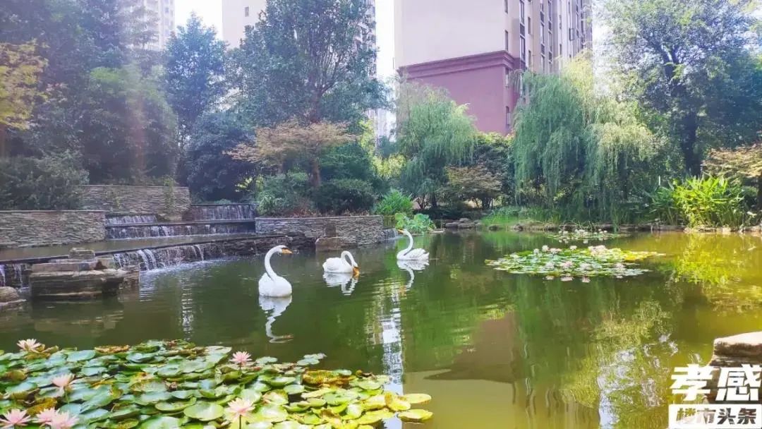 ? ? ? ?景觀池里,幾只天鵝在水中嬉戲,成群的觀賞魚在水中暢游,這樣的水景在孝感是不多見的。