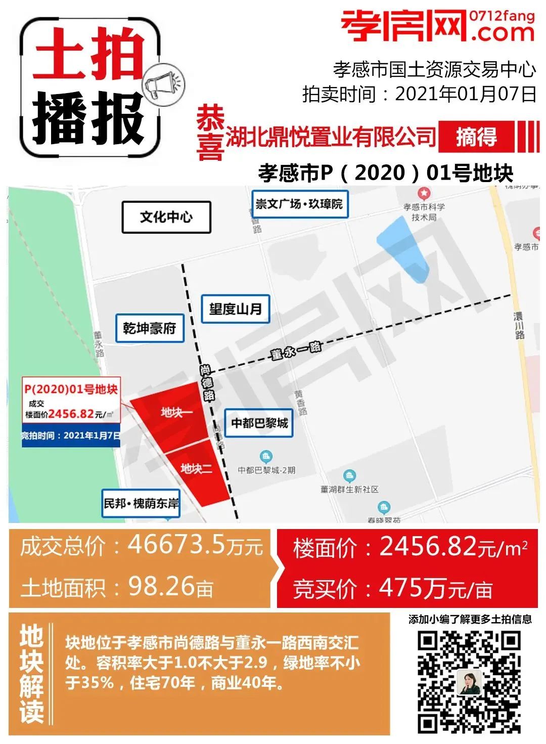 ? ? ? ?孝感市P(2020)01號地塊由湖北鼎悅置業(yè)有限公司競得,成交樓面價2456.82元/㎡,總價約4.67億元!