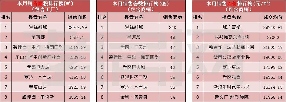 ? ? ? ?8月份新房銷售套數(shù)第?名為港錦新城240套,第?名為星河郡49套,第?名為孝感?車(chē)天地47套。