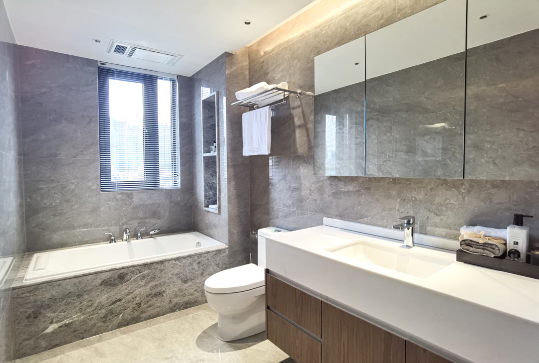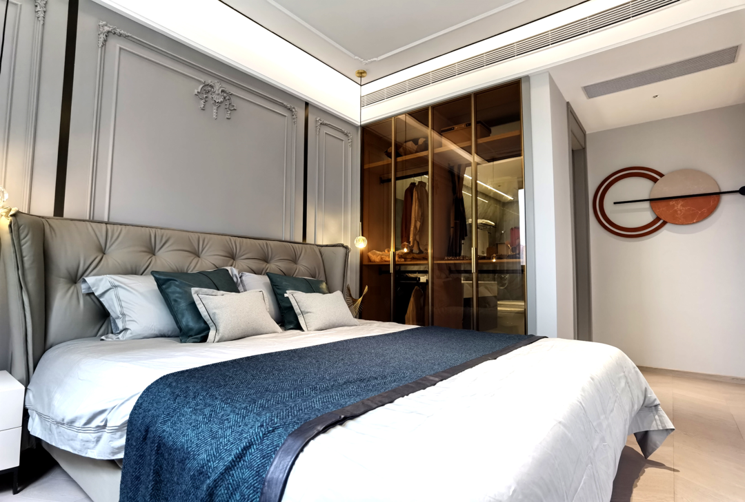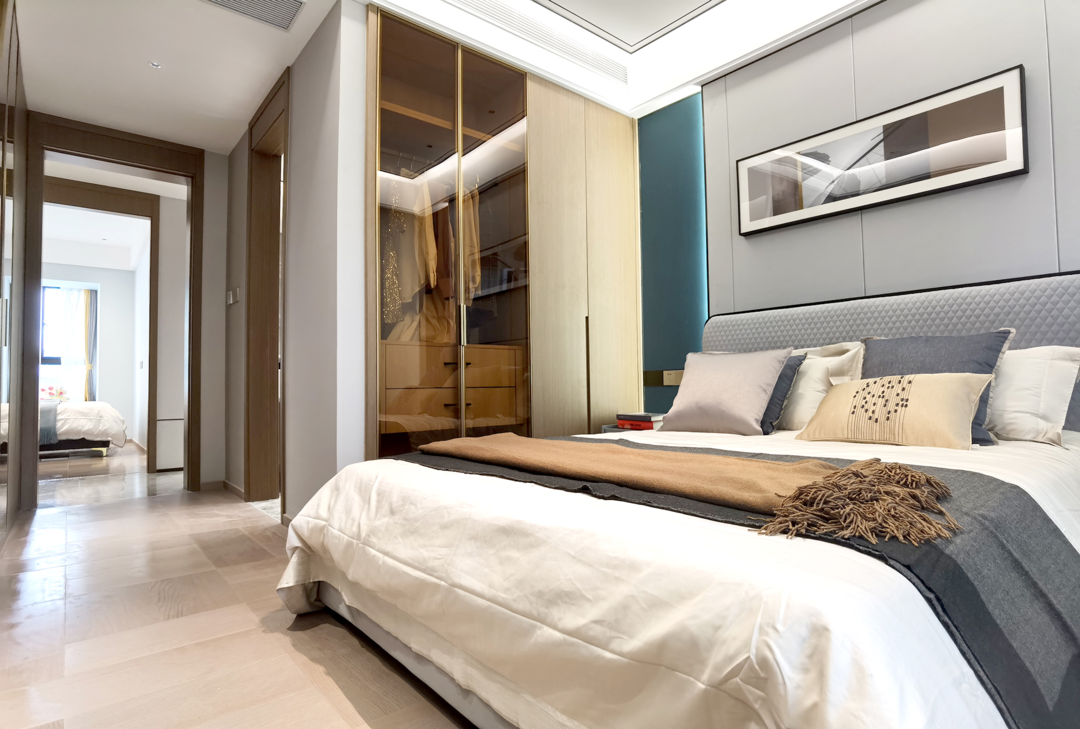 主臥套房設(shè)計,帶有獨立衛(wèi)生間,還有嵌入式衣帽間,觀感炫目又大方,一整套生活流程都能在此完成。