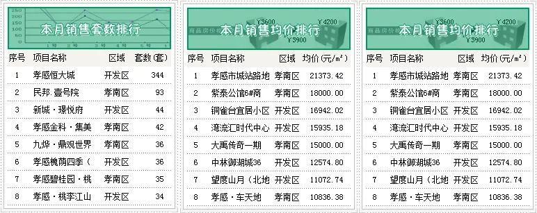 ? ? ? ?9月份新房銷量第?名為孝感恒大城344套,第?名為民邦·壹號(hào)院93套,第?名為新城悅雋44套。