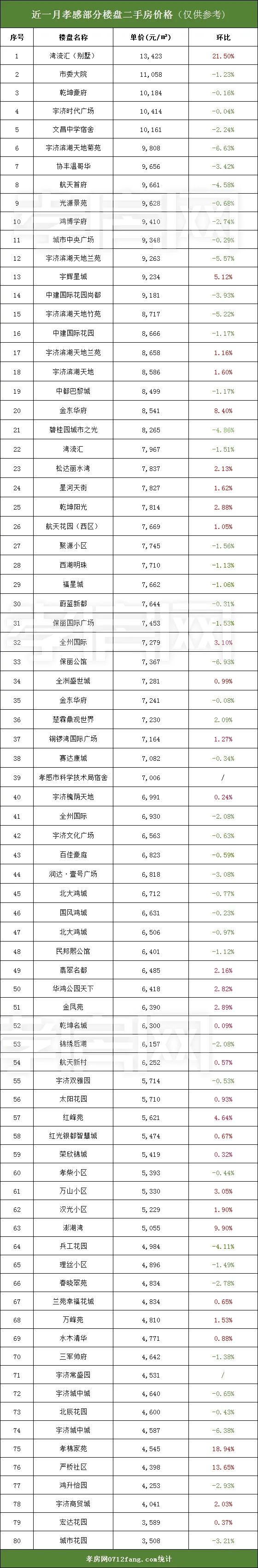 ? ? ? ?小編本次共統(tǒng)計(jì)了,孝感各區(qū)域共80個(gè)二手房房?jī)r(jià),有跌有漲!(紅色為漲,綠色為降)具體房?jī)r(jià)及漲幅一覽: