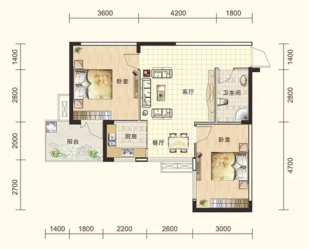 ? ? ? ?68㎡2室戶型非常緊湊,格局方正,兩室朝南,難能可貴的是雙陽臺(tái)配置,采光通風(fēng)非常好,并且?guī)缀鯚o浪費(fèi)空間。