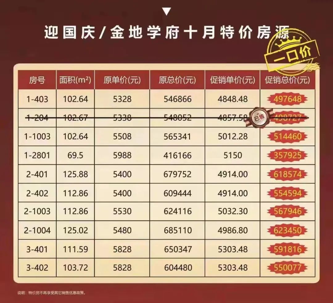 ? ? ? ?10月1日-31日,金地學(xué)府推出10套一口價房源,面積區(qū)間為建面約69.5-125.88元/㎡,總價最高優(yōu)惠61660元。