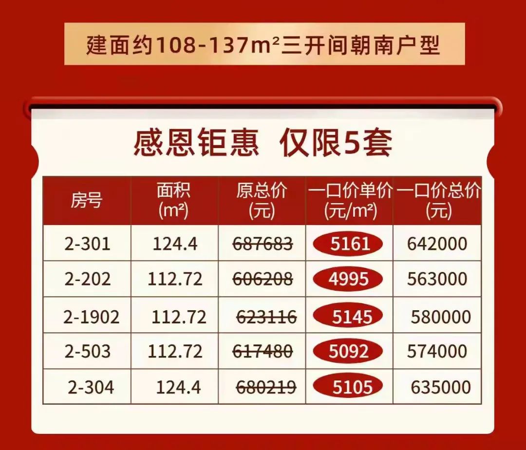 ? ? ? ?城西品質(zhì)文教新盤,感恩鉅惠,推出5套一口價房源,建面約112.72-124.4㎡,最高直降45219元!
