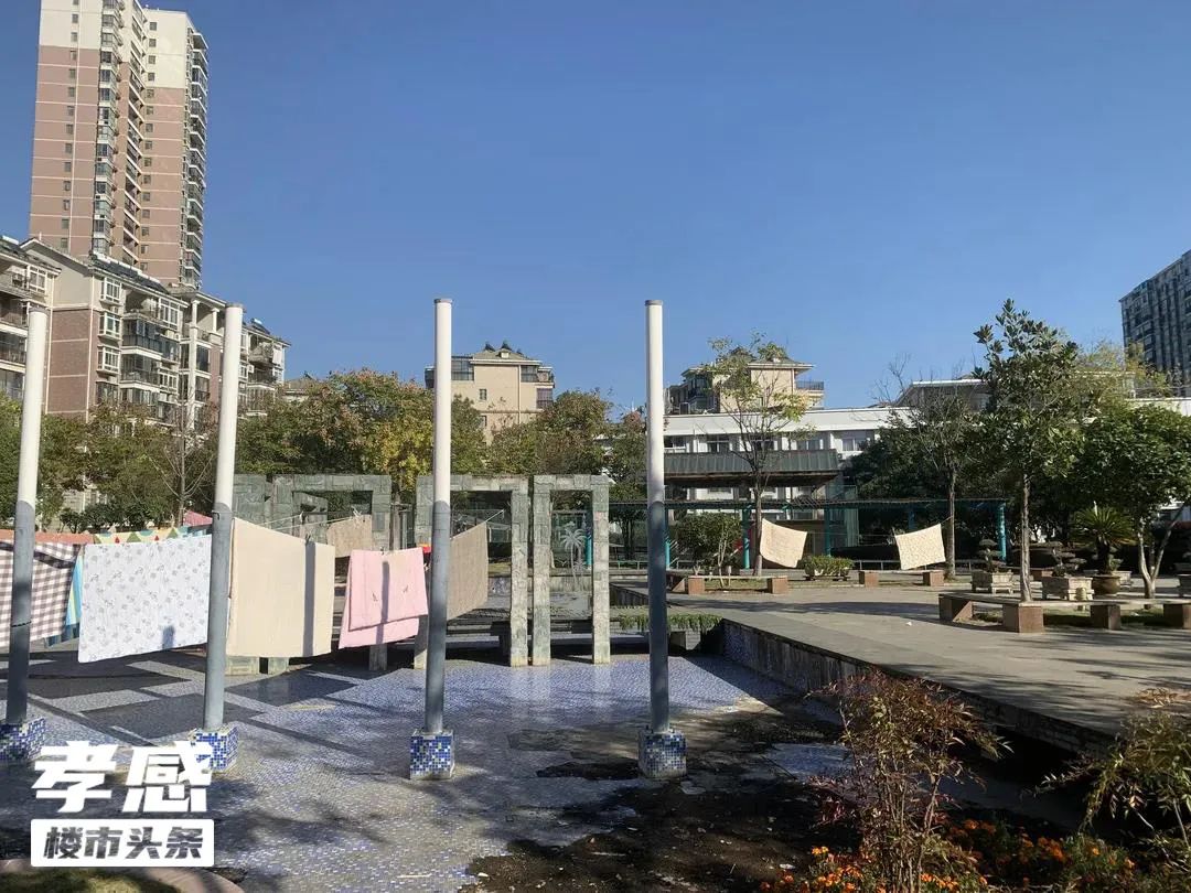? ? ? ?景觀水池中的噴泉能看出來已經(jīng)棄用許久,景觀區(qū)的水池里面的水目前已經(jīng)無水了,四周散落了不少枯萎的樹葉,有很多業(yè)主在此晾曬被褥。