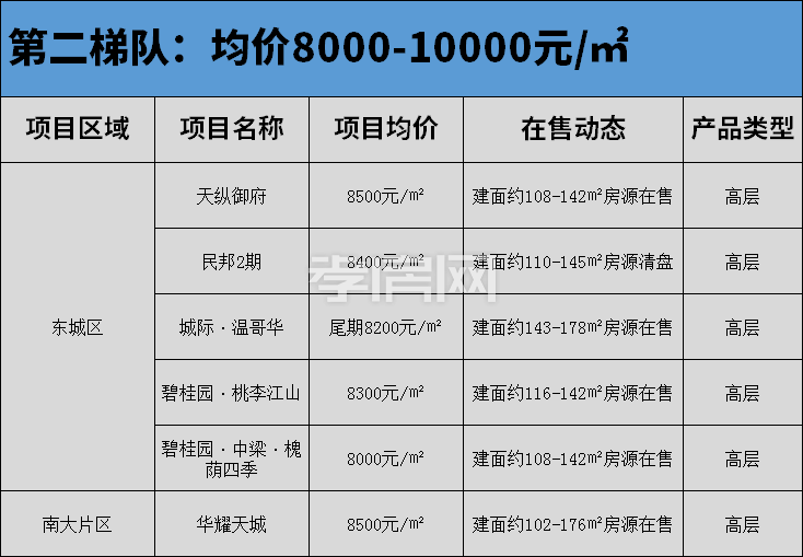 ? ? ? ?該梯隊共9個樓盤,基本都分布在東城區(qū)和老城區(qū),雖然大多數都不屬于區(qū)域內的正中心位置,但也能享受板塊內的利好,是剛改客的首選。