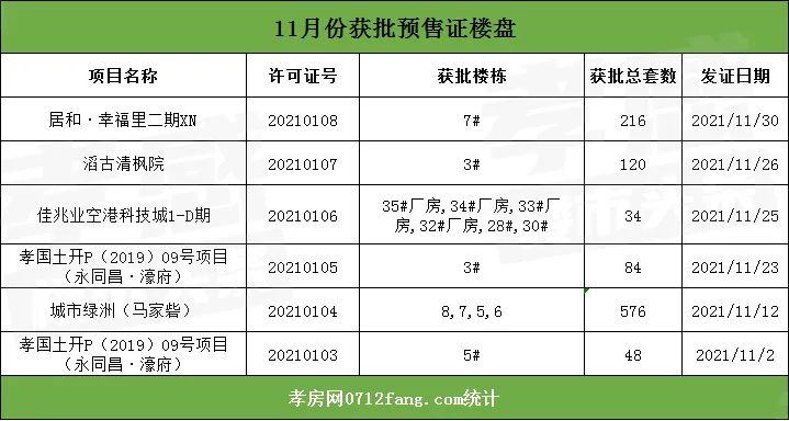 ? ? ? 11月份孝感獲批銷售許可證樓棟一覽,1078套房源入市。