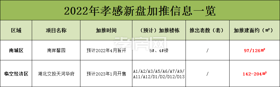 ? ? ? 據(jù)孝房網(wǎng)不完全統(tǒng)計,2022年孝感樓市預計將有21個樓盤有加推的計劃。
